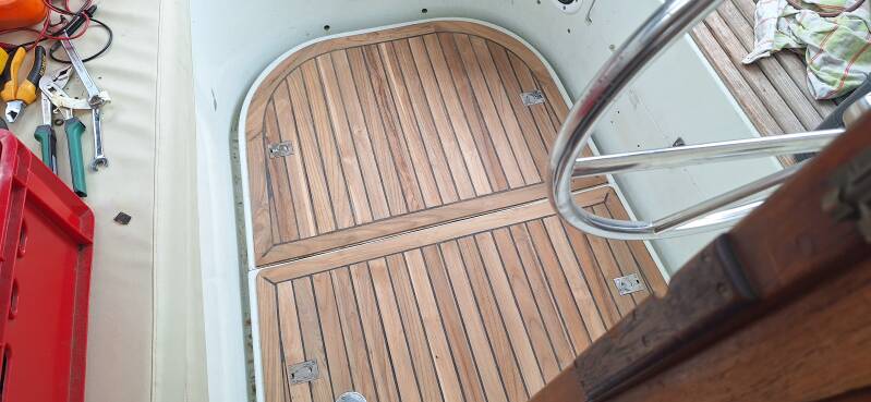 Leo heeft een prachtige teakhoutenvloer in de kuip gemaakt. Deze update geeft niet alleen een warme, natuurlijke uitstraling aan het interieur, maar zorgt ook voor extra comfort en een duurzame basis in een belangrijk deel van het schip.